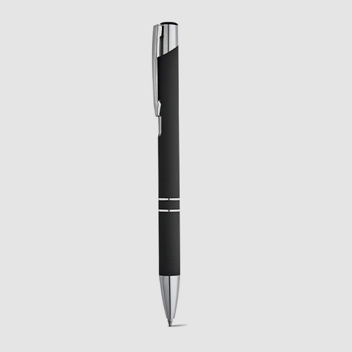 Ce stylo à bille publicitaire en aluminium est composé d’une finition gomme effet Soft Touch, de bagues chromées ainsi que d’un bouton poussoir. Stylo promotionnel personnalisable avec logo ou texte publicitaire. le stylo.
