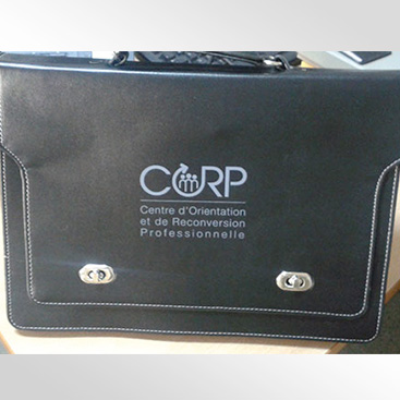 Cartable simili cuir CORP Nous avons mis à la disposition de centre d’orientation et de reconversion professionnelle des cartables en simili cuir , qui ont été personnalisée en utilisant la technique de sérigraphique sur la face externe. projet effectué : Janvier 2015