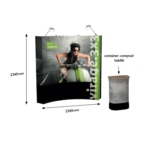 Idéal pour un habillage d’un stand de 9m² à 12m² et très efficace pour les voyages et les événements flash (une demi journée ou une journée) ainsi que les séminaires et les expos.